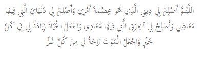 “Ya Allah, perbaikilah agamaku untukku yang mana ia merupakan penjaga perkaraku. Perbaikilah duniaku yang di dalamnya terdapat kehidupanku. Perbaikilah akhiratku untukku yang di dalamnya terdapat tempat kembaliku. Jadikanlah hidupku sebagai tambahan untukku dalam setiap kebaikan, serta jadikanlah matiku sebagai istirahat untukku dari segala keburukan.” (HR Muslim 4897)[via]