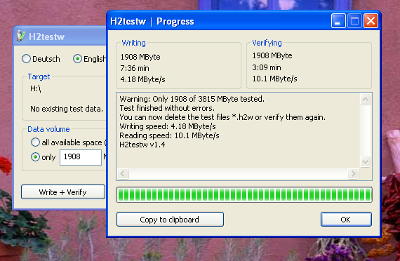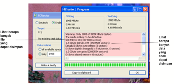 H2TESTW adalah software yang biasa digunakan untuk mengecek sebuah media penyimpan termasuk didalamnya flashdisk apakah error atau nggak.