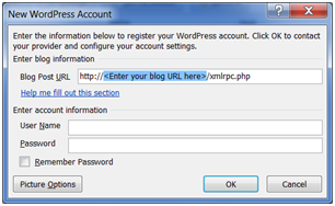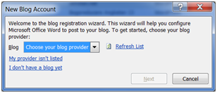 Kedua, setting account blog anda, Ms Word 2007 mendukung engine blog Windows Live Spaces, Blogger, SharePoint Blog, Community Server, TypePad, WordPress, dll, jadi silakan pilih sesuai engine blog anda