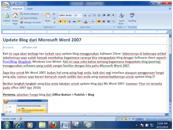 Berikut langkah-langkah yang bisa anda lakukan untuk update blog dari Ms Word 2007. (catatan: Fitur ini tersedia pada office 2007 dan 2010)