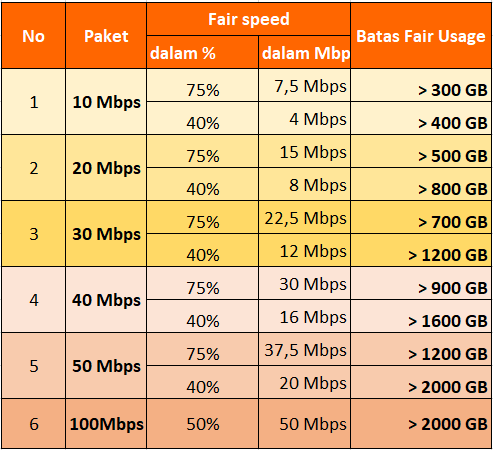 Nah terus berapa FUP untuk masing-masing Kecepatan? Saat artikel ini dibuat (Maret 2019) berikut ketentuan FUP sesuai kecepatan Internet: